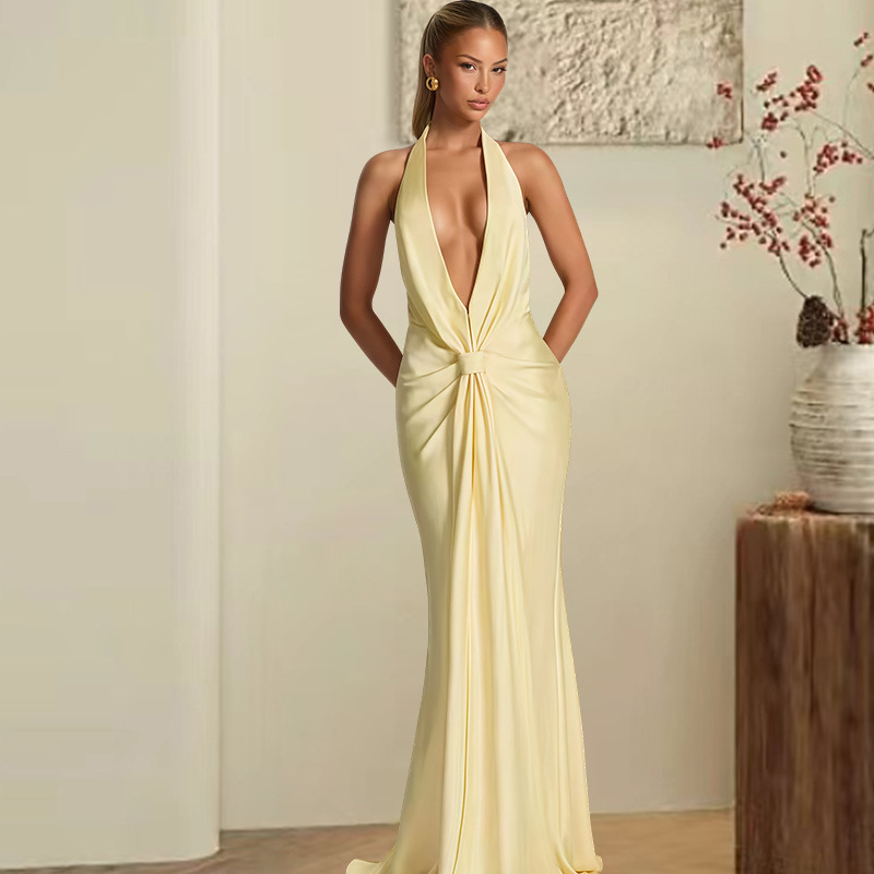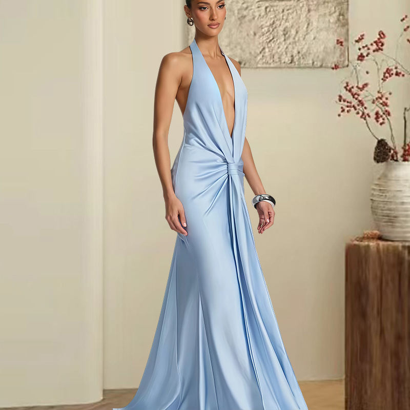 Command attention the moment you enter the room with the Ilana Deep V-Neck Fishtail Dress — a design created to celebrate your curves, define your waist, and give you a presence that feels both graceful and powerful. The deep V-neck draws the eye upward, elongating your neckline, while the halter style creates a confident, feminine frame.