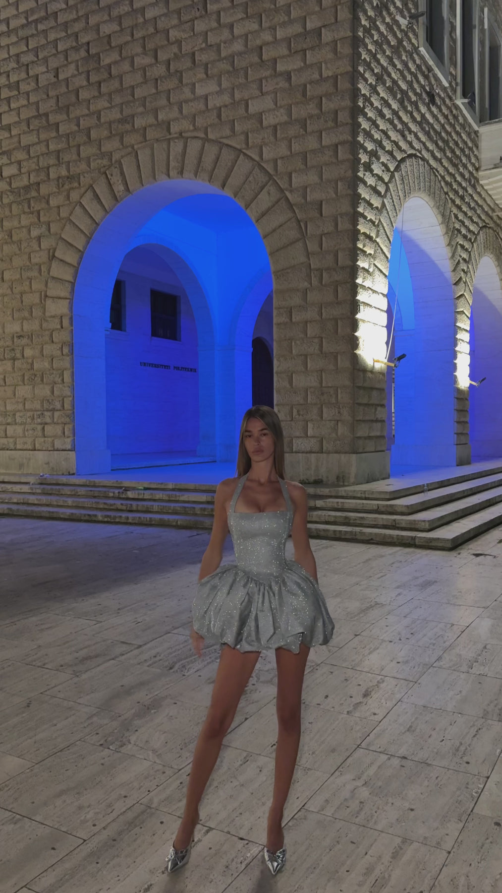 Crafted from a finely woven silver glitter fabric, Giselle reflects light with refined brilliance, creating a luminous glow that moves beautifully with you. The structured square neckline and elegant halter straps frame the shoulders with sophistication, while the open lace-up back adds a subtle touch of allure and allows for a perfectly adjustable, figure-enhancing fit.